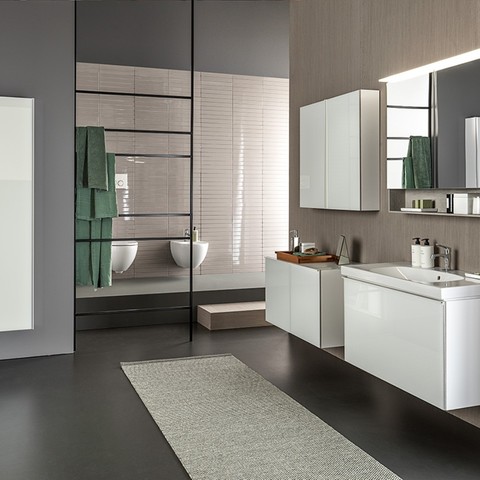 Przy projektowaniu mebli łazienkowych połączyliśmy ze sobą różne materiały i wykończenia, np. szkło, metal, powierzchnie malowane i drewniane, by w ten sposób nadać im unikalny i nacechowany wysoką jakością wygląd. Fronty z kolorowanego szkła oraz kolorystycznie skoordynowane metalowe uchwyty tworzą jednolitą całość.