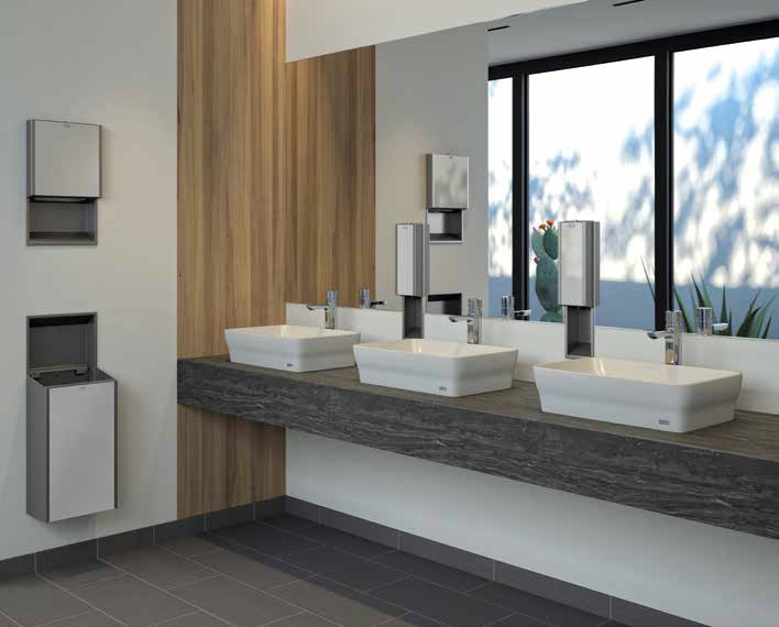 - EXOS – smukły kształt i możliwość wyboru wersji kolorystycznej (chrom, czerń lub biel) pozwalają na łatwe dopasowanie tego modelu do wystroju publicznej łazienki.