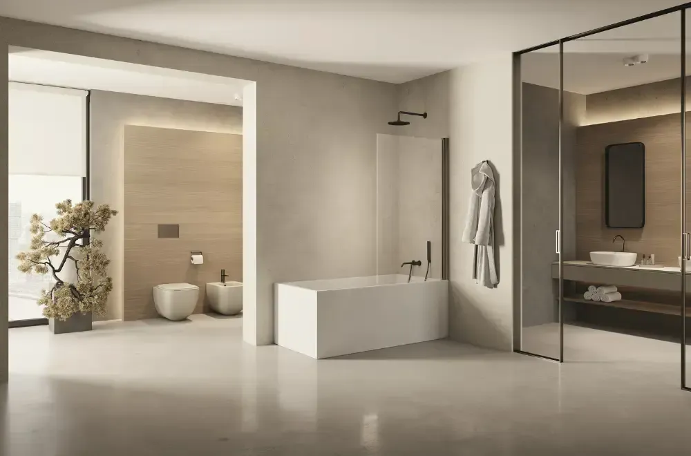 Parawany New Soleo są dostępne m.in. w wersjach kolorystycznych Copper Brushed i Gunmetal Brushed. Profile w tych odcieniach robią nadają wnętrzu charakteru i efektownie wpisują się w nowoczesne łazienkowe aranżacje.