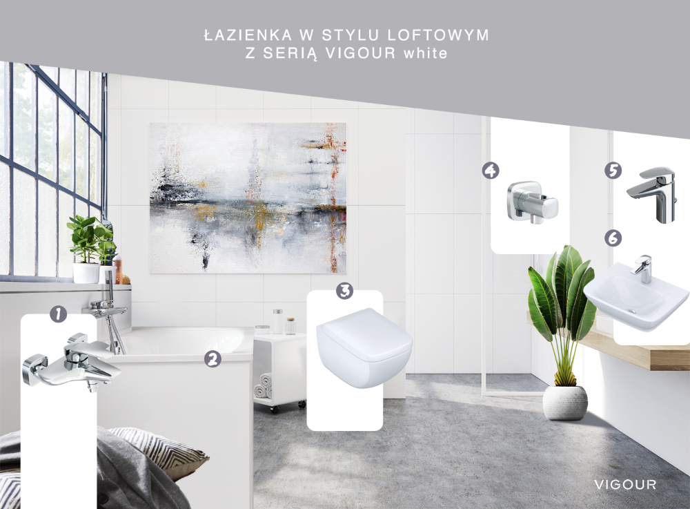 Wyposażenie loftowej łazienki musi pasować do surowego wystroju otoczenia – dobrze więc, by wyróżniał się minimalistyczną formą i prostą kolorystyką. Takie właśnie są produkty z kolekcji VIGOUR white, które doskonale wpisują się w industrialną konwencję wnętrz. Perfekcyjna biel jest tutaj zestawiana z ponadczasową barwą chromu, a łagodne, zaokrąglone formy dodają wyposażeniu łazienki lekkości, która tak pięknie uzupełni bardzo wyraziste, typowe dla loftowej scenerii rozwiązania.