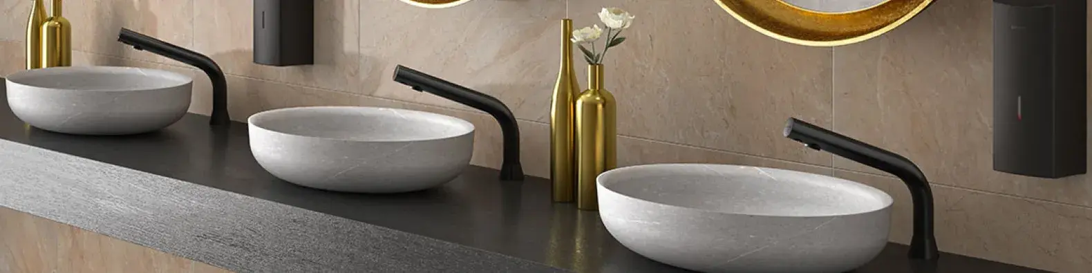 Tak nowatorskie rozwiązania wyjątkowo dobrze sprawdzają się w łazienkach publicznych, które często jako pierwsze czerpią inspiracje z najnowszych trendów. Baterie BLACK BINOPTIC zachwycają swoją głęboką, ciemną barwą, która dodaje wnętrzom nowoczesnego sznytu.