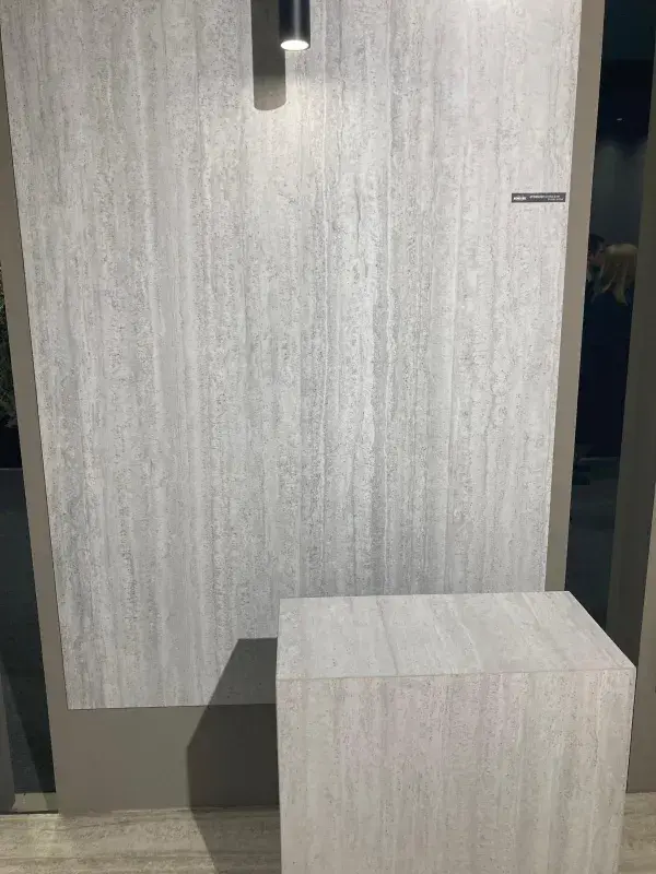 Przede wszystkim, poza wspomnianym wykładem, targi były doskonałą okazją, żeby zobaczyć największe płytki produkowane w Europie. Jedna płytka ma niezwykle imponujący wymiar 1840x3300 mm. Za ten innowacyjny projekt odpowiada marka Optimum Surfaces i trzeba przyznać, że prezentowane wzory wyglądają pięknie w tak dużym rozmiarze. Jednak wiele osób zastanawiało się zatem co w takiej sytuacji z transportem, wnoszeniem do pomieszczeń, trzymaniem na magazynie, kładzeniem jej przez fachowców? Z pewnością jest to spore wyzwanie, ale dla najlepszych fachowców nie ma rzeczy niemożliwych. Najwyższej klasy specjaliści poradzą sobie nawet z dużym formatem. Co więcej, takie płytki idealnie wpiszą się w nowoczesne aranżacje.
