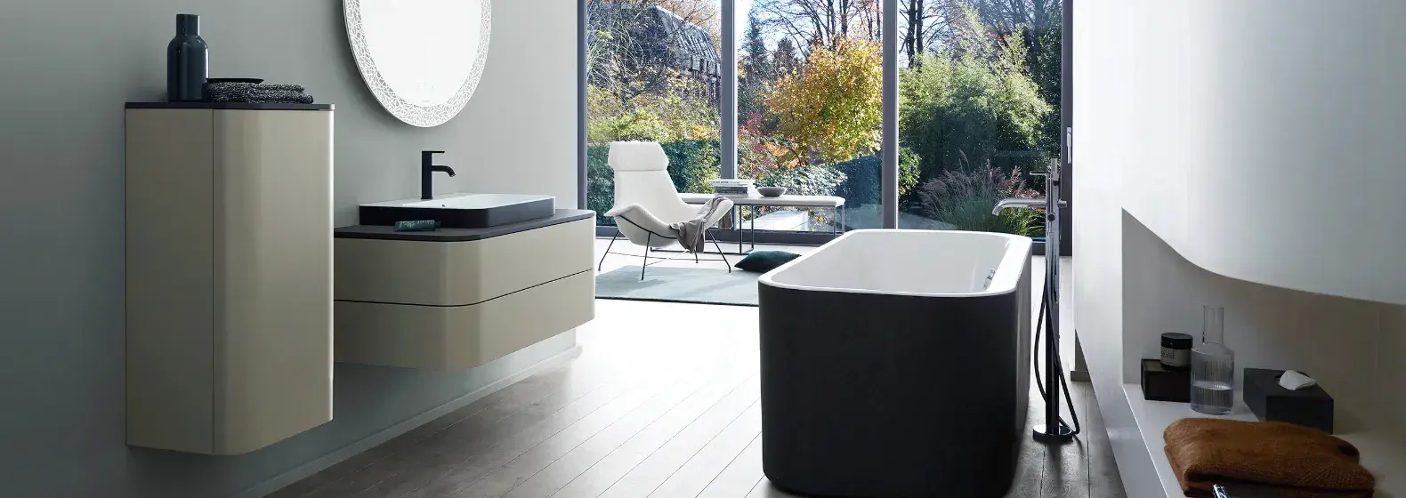Łagodne formy umywalki i wanny korespondują z równie zaokrąglonymi krawędziami mebli łazienkowych. Okrągłe jest tu również lustro, a do obłej formy nawiązują także baterie – umywalkowa i wannowa. Odprężająca jest także kolorystyka łazienki – biel, szarość i beż kontrastują z mocnym, antracytowym wykończeniem wanny i umywalki.