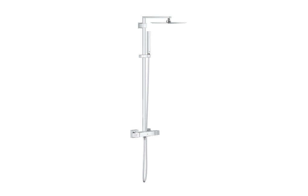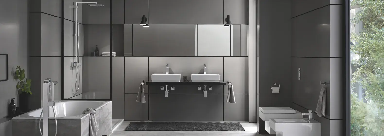 Produkty z kolekcji Eurocube to armatura z charakterem. Wyraziste, mocno zarysowane krawędzie mają na celu uwydatnić nawiązania do geometrycznych form, które odważnie wpływają na wystrój całej łazienki. Kwadraty i prostokąty stanowią bazę prezentowanej aranżacji – nie skąpiono ich ani podczas wyboru płytek, ani nawet przy wyposażaniu pomieszczenia w ceramikę sanitarną.