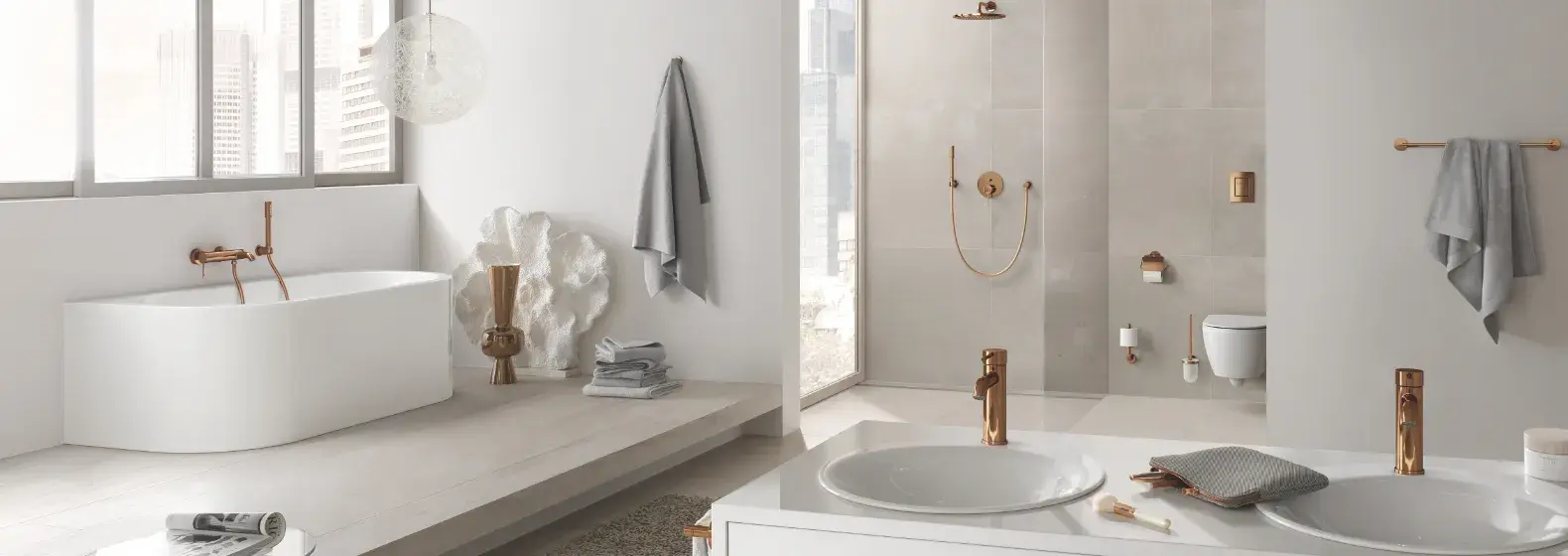 Wybór odpowiednich dodatków łazienkowych może całkowicie odmienić wystrój pomieszczenia. Najlepszym dowodem na to są produkty z kolekcji Essence i Essentials, dzięki którym każde wnętrze zyskuje odrobinę ciepłego blichtru. Zarówno armatura Essence, jak i dodatki Essentials są tutaj utrzymane w kolorze ciepłego złota, przypominającym zachód słońca.