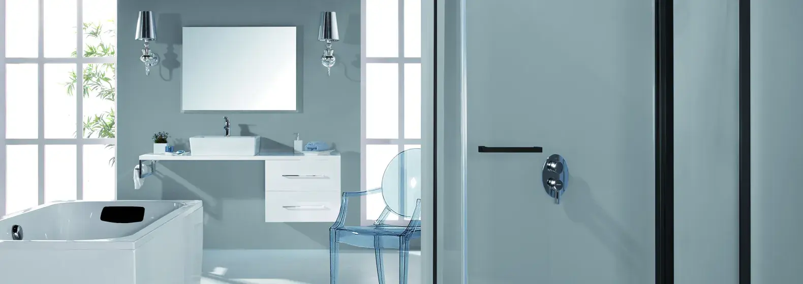Te same idee przyświecały przy projektowaniu pozostałych stref łazienkowych – dominują tu biel i szarość, a czerń pojawia się jedynie w detalach. Całe pomieszczenie jest więc doskonale przejrzyste – w przenośni i dosłownie. Warto bowiem zwrócić uwagę chociażby na przezroczyste krzesło czy metaliczne kinkiety wtapiające się w tło.
