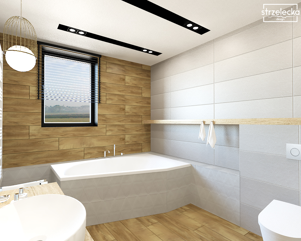 Pomieszczenie uzupełnione zostało drewnianymi powierzchniami w nieprzypadkowy sposób. Aż trzy drewniane płaszczyzny łączą się ze sobą w jednym ciągu – poczynając od drzwi, poprzez posadzkę, aż po ścianę z oknem. Drewniane są również detale – blat szafki i po przeciwległej stronie listwa, na której znajdują się wieszaki. Wszystko to koresponduje z ażurowymi, złotymi lampami oraz srebrnym, metalicznym odcieniem armatury wannowej i umywalkowej, a także przycisku spłukującego do WC. Całość tworzy wyjątkową harmonię o nowoczesnym wydźwięku.