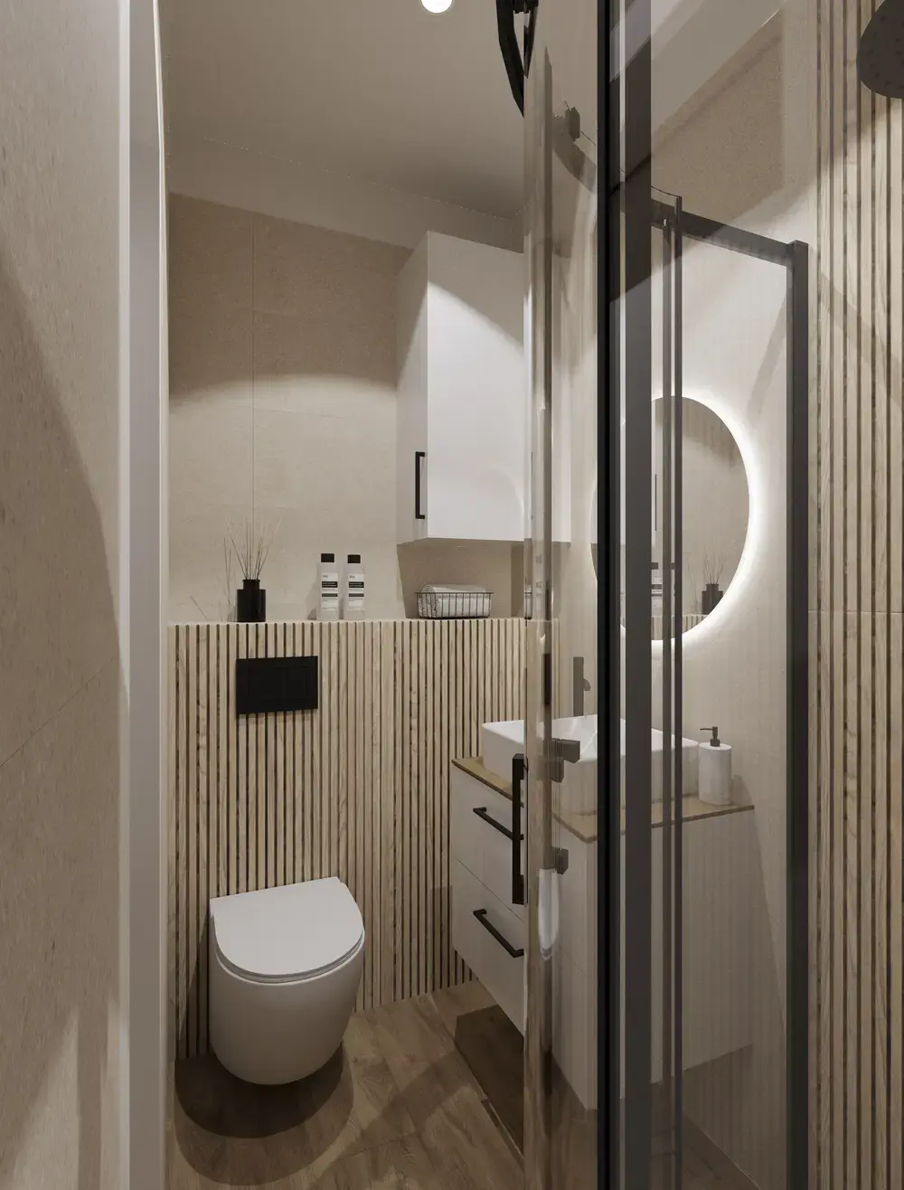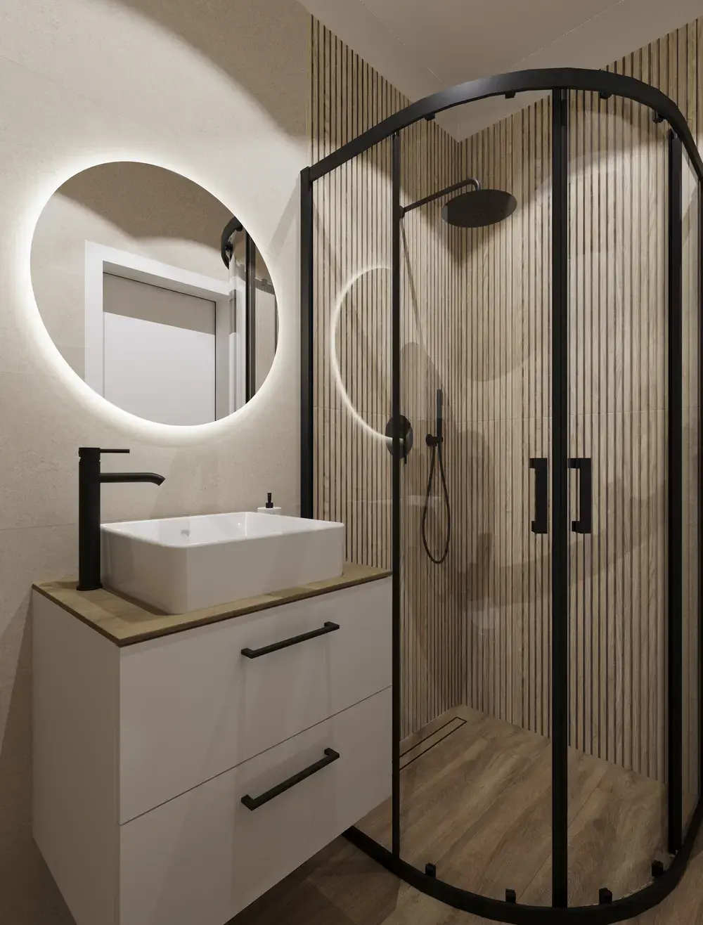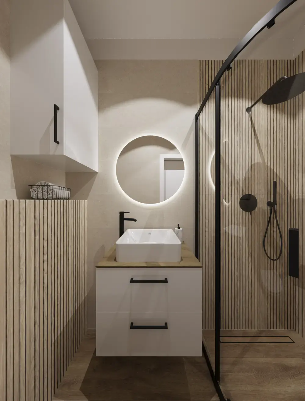 Jeśli chodzi o strefę umywalkową to mamy tutaj prosta szafkę pod umywalkę w białym odcieniu z blatem imitującym drewno. To klasyczne, ale przy tym modne połączenie. Umywalka nablatowa biała o prostokątnej formie podkreśla nowoczesny charakter wnętrza, a okrągłe lustro z podświetleniem z tyły dodaje lekkości i głębi. Ciepłe światło wydobywa strukturę materiałów, tworząc przyjazny klimat bez potrzeby stosowania dodatkowych dekoracji.