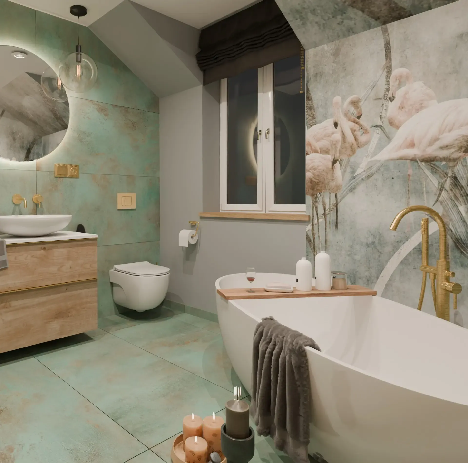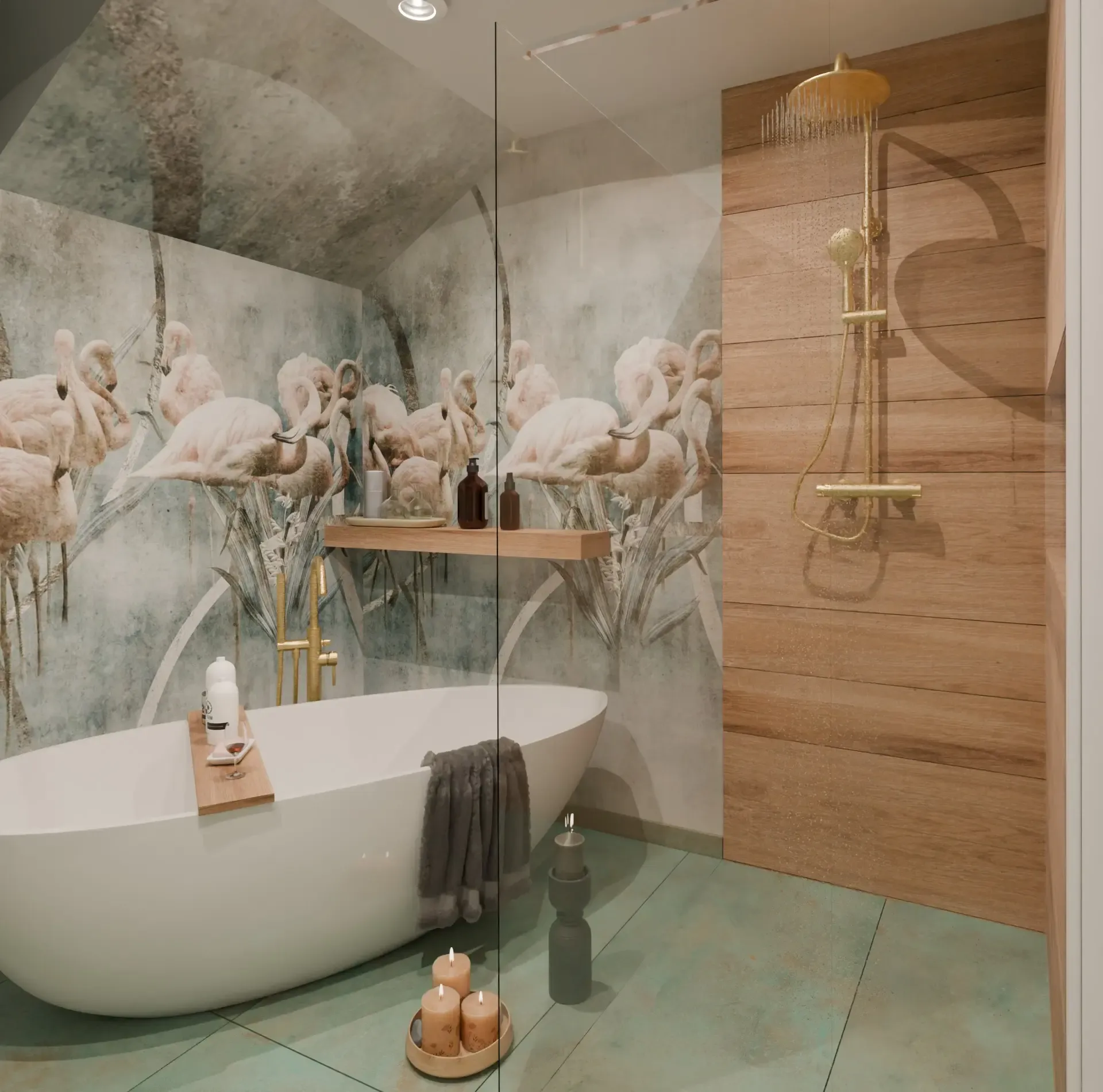Ta realizacja udowadnia, że łazienka może stać się przestrzenią wyrazu, a nie tylko funkcjonalnym pomieszczeniem. Zestawienie ciepłego drewna, chłodnej patyny, złotych detali i artystycznego tła w postaci flamingów tworzy wnętrze pełne kontrastów, które jednak pozostają w równowadze. Idealne do zainspirowania się.