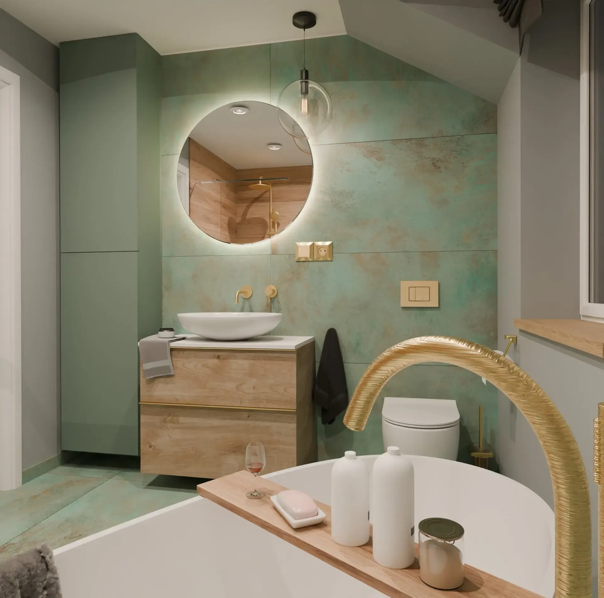 Szczotkowane złoto to ważny akcent tej aranżacji. Pojawia się w armaturze oraz detalach strefy WC i umywalkowej. Barwa ta jest subtelna, ale wyrazista, a przy tym elegancka – działa jak biżuteria wnętrza. Łączy się zarówno z drewnem, jak i z patynowaną zielenią, nadając aranżacji elegancji bez wrażenia przepychu. To doskonały przykład, jak stosować szlachetne akcenty w sposób wyważony i świadomy.