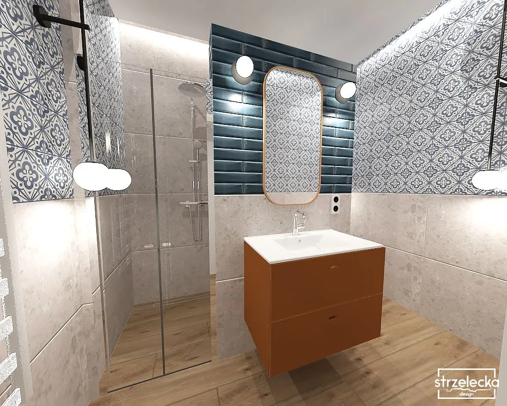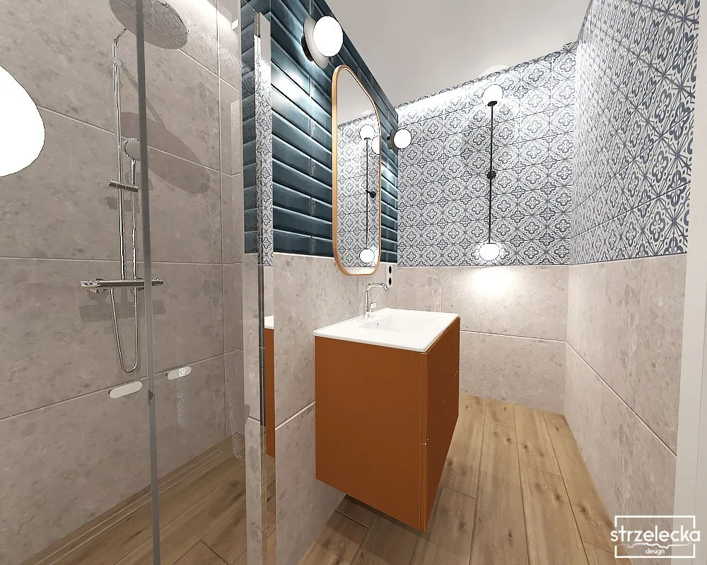 Dodatkowo mozaikowe płytki rodem z Portugali mamy pod prysznicem, co stanowi doskonały akcent ozdobny. Można je także podziwiać w strefie WC, gdzie tworzą spójny rytm z częścią prysznicową i optycznie wydłużają pomieszczenie.