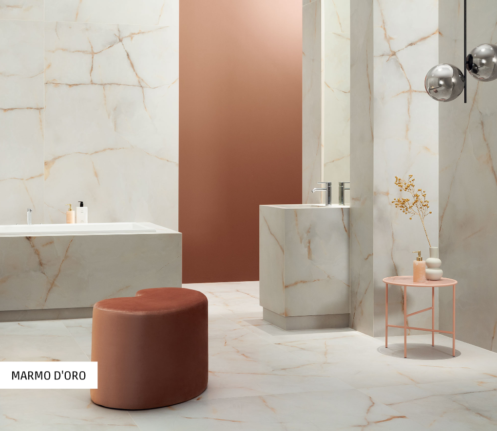 W pierwszym wariancie aranżacji jedno zwraca uwagę: jedyne w swoim rodzaju połączenie ekskluzywnego szyku z przytulnością w duchu hygge. To przede wszystkim zasługa zestawienia dwóch kontrastowych materiałów: gresu przypominającego marmur z panelami imitującymi ciepłe drewno. Całość, uzupełniona lustrzanymi powierzchniami i błyszczącymi dodatkami, nabiera stylowego, ale miłego w odbiorze charakteru. Warto zwrócić uwagę również na wysmakowaną paletę odcieni: krem, orzech i złoto to wyjątkowo apetyczna mieszanka.