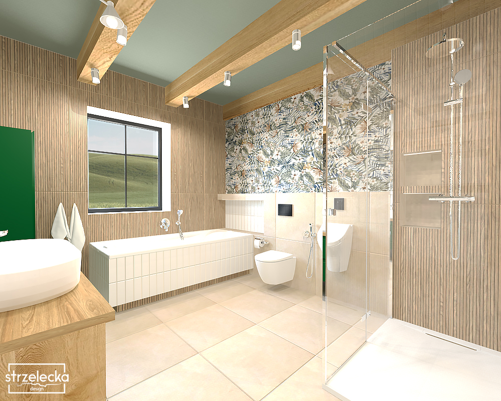 Obydwie wizualizacje łazienek są do siebie bardzo podobne. Mamy naturalny materiał, jakim jest drewno w postaci belek czy też szafek podumywalkowych. Do tego jasne płytki na podłodze, zielony dodatek na ścianie czy wygodną wannę oraz przestrony prysznic. Natomiast elementem odmiennym przede wszystkim są płytki. W ten wizualizacji na ścianie nad wanną znalazły się wzorzyste kafelki z fotorealistycznym motywem ptaka. To wyjątkowy detal, który przyciąga wzrok i wprowadza do wnętrza element natury w pełnej okazałości, czyniąc z niej nie tylko miejsce relaksu, ale także oryginalną przestrzeń, w której natura może iść w parze z nowoczesnym designem. Do tego jasny sufit wprowadza sporo światła do wnętrza.