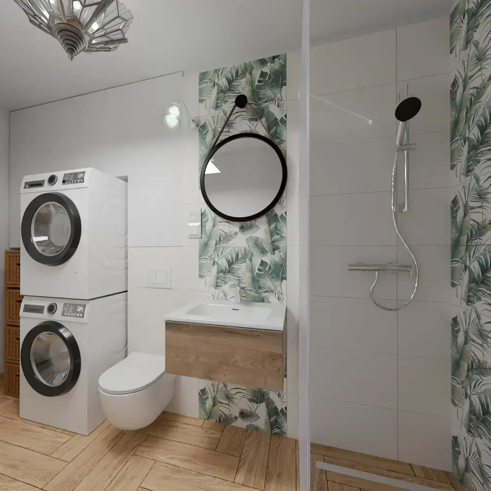 Ta łazienka to połączenie egzotyki, nowoczesności i codziennej wygody. Motyw tropikalnych liści, jasne powierzchnie i podłoga w jodełkę z płytek imitujących drewno tworzą przestrzeń, która zachwyca pozytywną energią, a przy tym gwarantuje funkcjonalność każdego dnia.