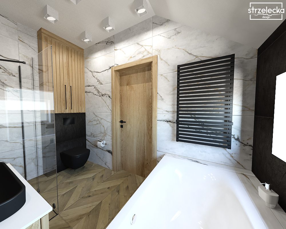 Czasem wystarczy niewielka zmiana, żeby aranżacja łazienki nabrała kompletnie innego charakteru i lepiej oddawała aktualne trendy. Nie chcesz robić kompletnego remontu wnętrza, z wymianą ceramiki i armatury? Zmień wygląd ścian i podłogi, a pozostałe elementy nabiorą wyrazu. Jednym z najciekawszych sposobów na odświeżenie łazienkowej aranżacji, zwłaszcza takiej o minimalistycznym wystroju, jest wybór gresu imitującego drewno i marmur. Takie materiały to jeden z najmocniejszych wnętrzarskich trendów ostatnich kilku sezonów. Mogą być zastosowane solo albo w wysmakowanym duecie, jak w aranżacji Strzelecka Design. Studio projektowe zaproponowało wizję przestrzeni z wanną i natryskiem typu walk-in, w której nastrój buduje właśnie niezwykły duet faktur, inspirowane rysunkiem słojów drewna i marmurowym żyłkowaniem.