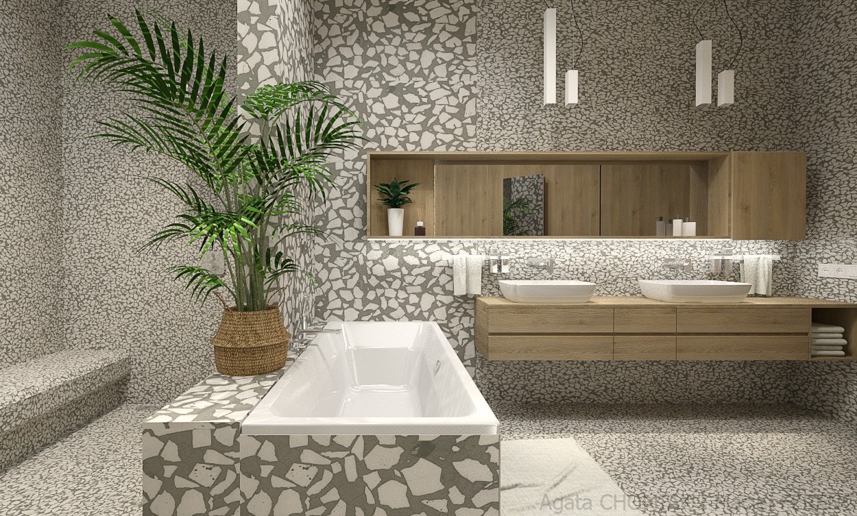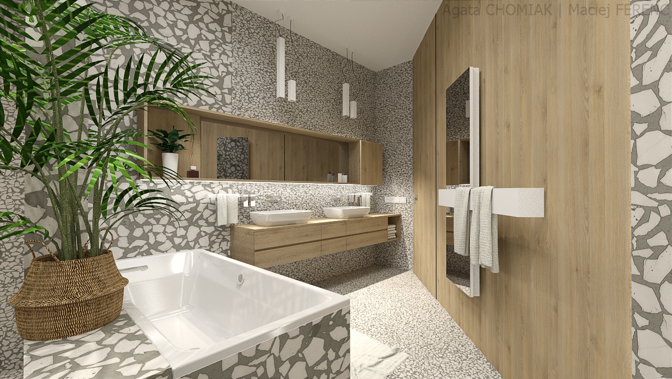 Oryginalną łazienkę uzupełniliśmy drewnianymi meblami i powierzchniami, dzięki czemu całe pomieszczenie zyskuje na powadze i elegancji. Jasnobrązowe, ciepłe barwy współgrają także z zielenią roślin, które z kolei ożywiają nieco stonowane barwy marmurkowego wzoru. Całość łączy się zatem ze sobą w nieoczywisty, ale intrygujący, nowoczesny sposób. Kolejnym spoiwem aranżacji okazują się drobne, białe dodatki w postaci lamp, wieszaków, doniczek czy samej ceramiki sanitarnej.