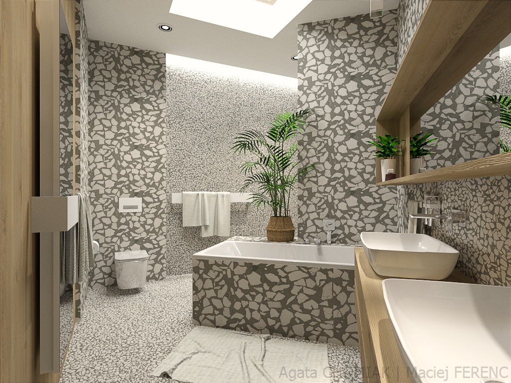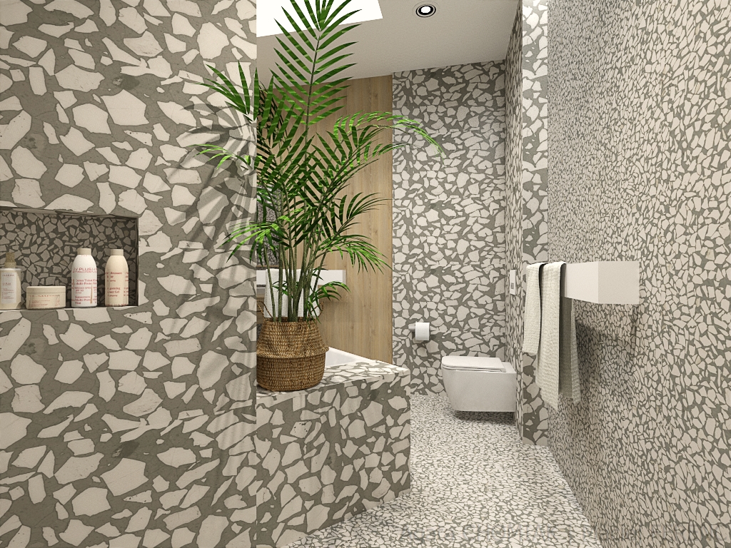 Marmurkowe powierzchnie cieszyły się ogromną popularnością kilka dekad temu. Dziś można je wykorzystać do tworzenia niebanalnych aranżacji przestrzeni. W przypadku łazienki zastosowaliśmy połączenie dwóch wzorów – jednego o drobnej fakturze i drugiego, zdecydowanie bardziej wyrazistego. Dzięki temu mogliśmy wyróżnić poszczególne strefy w małej łazience o nietypowym kształcie – granica pomiędzy przestrzenią umywalkową, kąpielową a toaletową jest wyraźna, a całe pomieszczenie zdaje się być lepiej zagospodarowane.