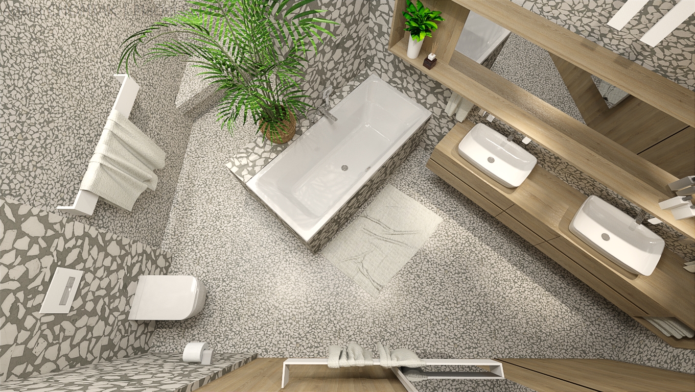 Urządzenie łazienki w kształcie trójkąta to nie lada wyzwanie. Projekt założył nietypowe rozwiązania, np. ściankę działową w środku pomieszczenia, do której przytulona została wanna. Dzięki temu zyskaliśmy dodatkowe miejsce we wnęce, idealnie nadające się na stworzenie strefy prysznicowej. Takie rozwiązanie pozwoliło na zaoszczędzenie przestrzeni i stworzenie blatu z aż dwiema umywalkami. To najlepszy dowód na to, że nawet nietypowa łazienka może stać się w pełni funkcjonalnym i komfortowym salonem kąpielowym, pielęgnacyjnym i higienicznym w jednym.