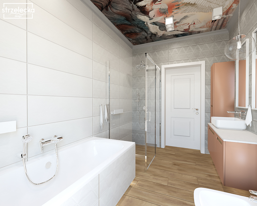 Co zrobić, by łazienka zachowała swoją elegancką formę, a jednocześnie zachwyciła nieoczywistymi, bardzo odważnymi rozwiązaniami? W tym przypadku postawiono na ogromną dekorację zajmującą cały sufit.