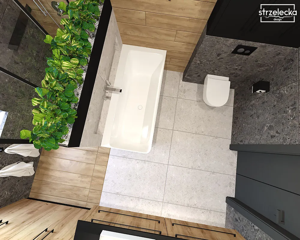 Projekt łazienki autorstwa Strzelecka Design łączy estetykę nowoczesnego minimalizmu z ciepłem naturalnych materiałów. Przemyślany układ funkcjonalny, wysokiej jakości wykończenia i zastosowanie zieleni tworzą przestrzeń komfortową, harmonijną i pełną wizualnego balansu. To wnętrze sprzyjające codziennemu relaksowi. Może stać się inspiracją dla osób szukających połączenia funkcjonalności z elegancką, miękką odmianą stylu industrial.