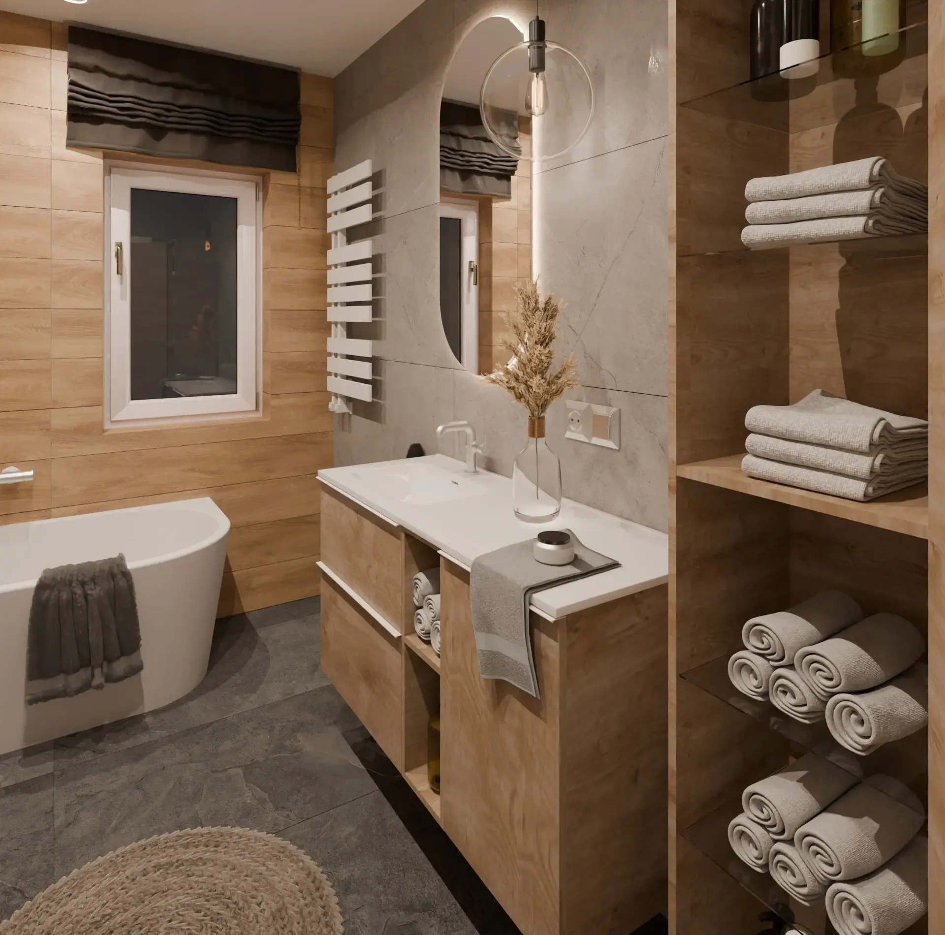Wanna narożna Eternity osadzona na tle drewnopodobnych płyt stała się dominantą wnętrza. Jej miękka linia kontrastuje z prostą geometrią ścian, a naturalna półka wzdłuż krawędzi wanny podkreśla charakter strefy relaksu. W projekcie zadbano o proporcje – wanna nie przytłacza niewielkiego metrażu.