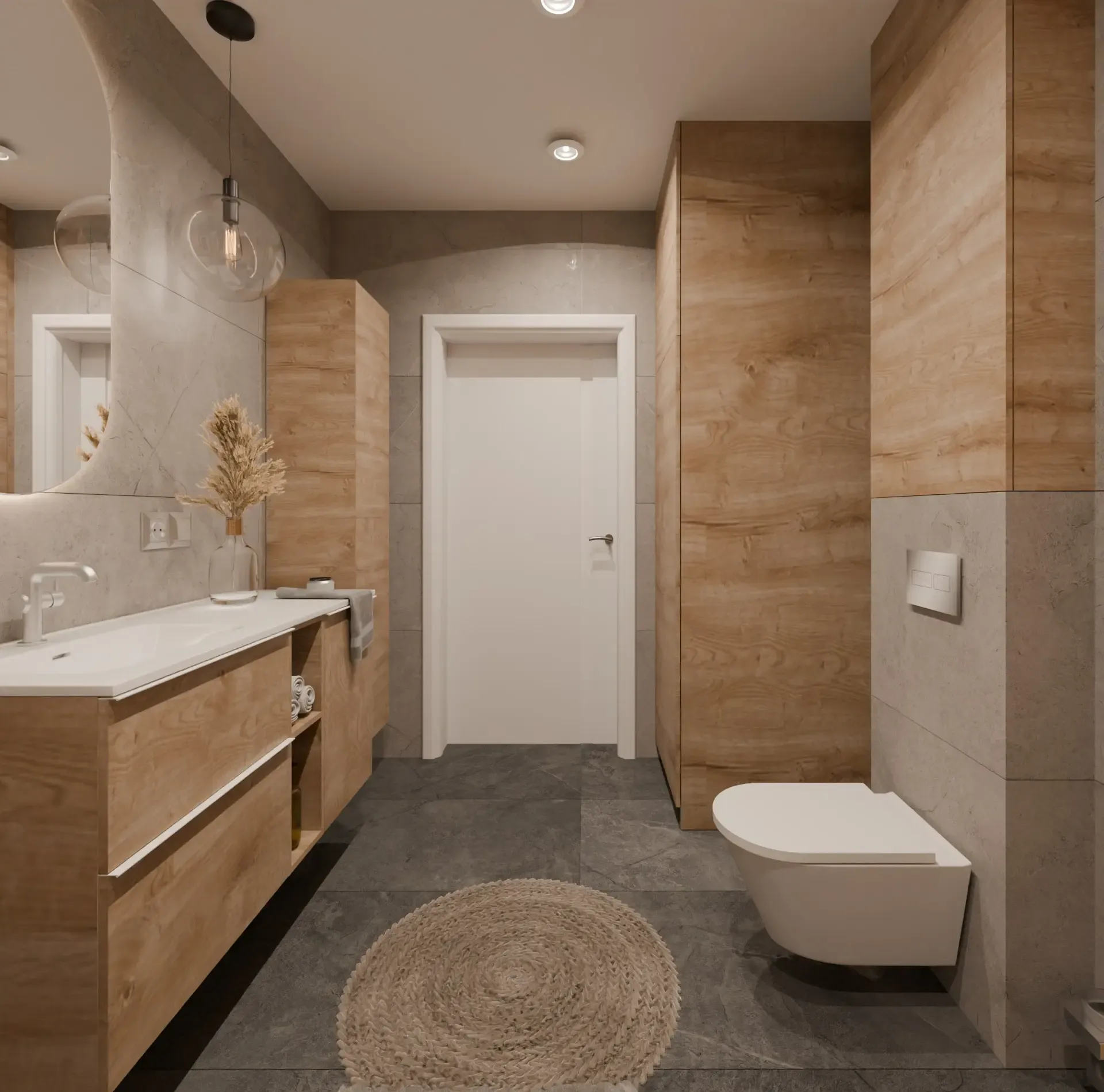 Dominujące zestawienie drewna i kamienia porządkuje przestrzeń i nadaje jej wyrafinowanego charakteru. Płytki gresowe imitujące drewno wprowadzają ciepło i miękkość, podczas gdy chłodna szarość kamienia równoważy całość, budując spokojne, ponadczasowe tło dla pozostałych elementów wyposażenia wnętrza. Wykończenia nie konkurują ze sobą, lecz współgrają, tworząc bazę dla subtelnych detali takich jak chociażby armatura czy przycisk spłukujący.