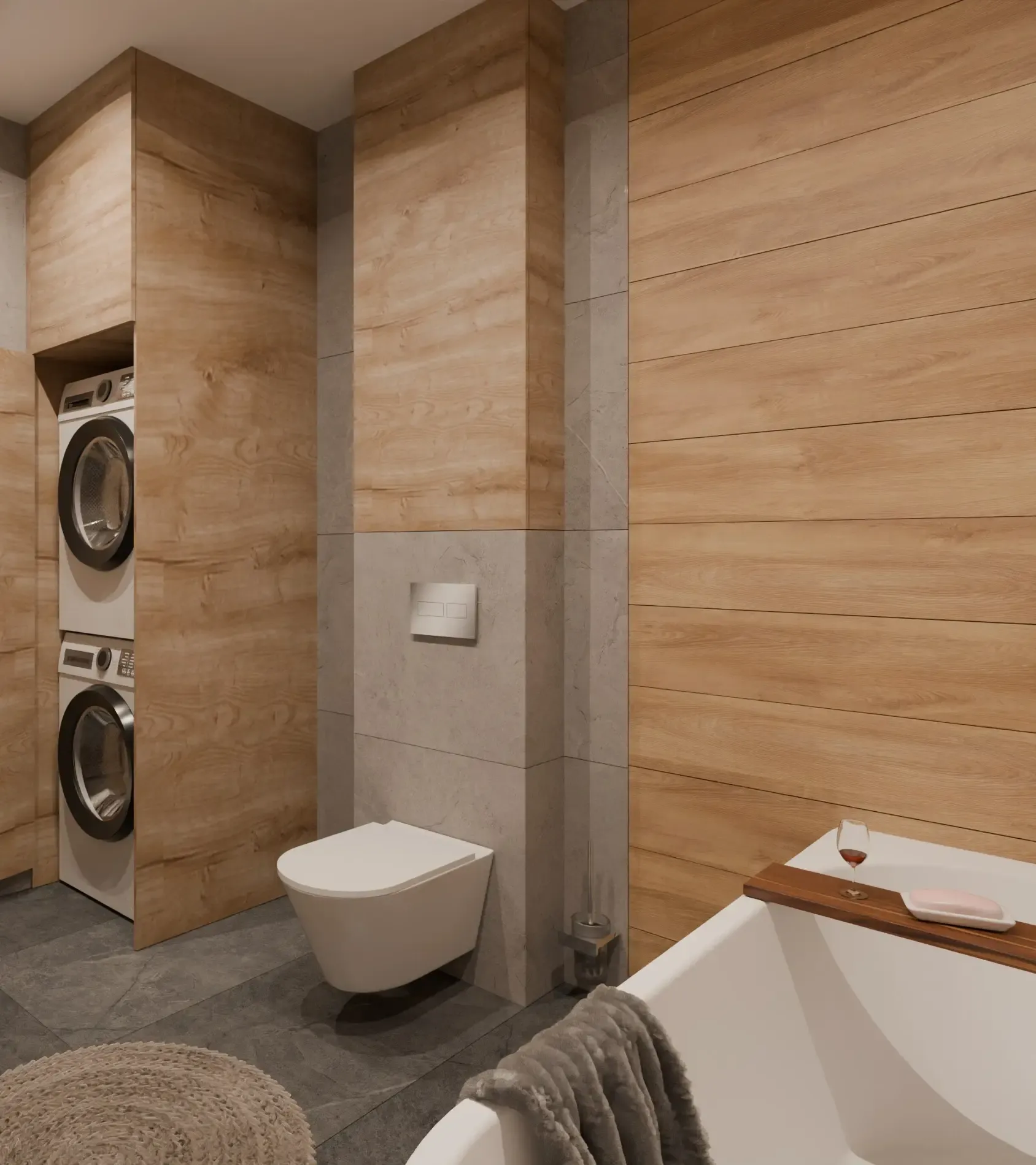 Projekt zakłada maksymalne wykorzystanie metrażu – pralka oraz suszarka została zabudowana, dzięki czemu łazienka pełni także funkcję pralni i wizualnie nie przytłacza przestrzeni. Zamknięte moduły porządkują wnętrze, a jednolita linia frontów w drewnianym dekorze podkreśla spójność aranżacji. Dzięki temu łazienka pozostaje uporządkowane, co optycznie ją powiększa.