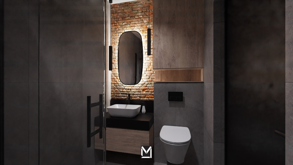 Ostatnia propozycja to strzał w dziesiątkę dla miłośników stylu industrialnego. Nie można przejść obojętnie obok odsłoniętej czerwonej cegły nad umywalką – to właśnie ona stanowi centrum aranżacji całej łazienki. Szczególnie imponująco prezentuje się w połączeniu ze światłem, jakie daje zawieszone na ścianie lustro.