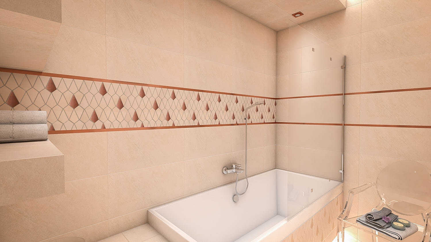 W aranżacji podłużnej łazienki unikaliśmy ciemnych kolorów, postawiliśmy natomiast na ciepłą, kremową, wpadającą w brzoskwiniową barwę. Taki odcień tworzy głębokie wrażenie przytulności, dzięki czemu łatwiej można się zrelaksować podczas domowych zabiegów spa. Wnętrze uzupełnia także ponadczasowa biel grzejnika, drzwi ceramiki oraz mebli.