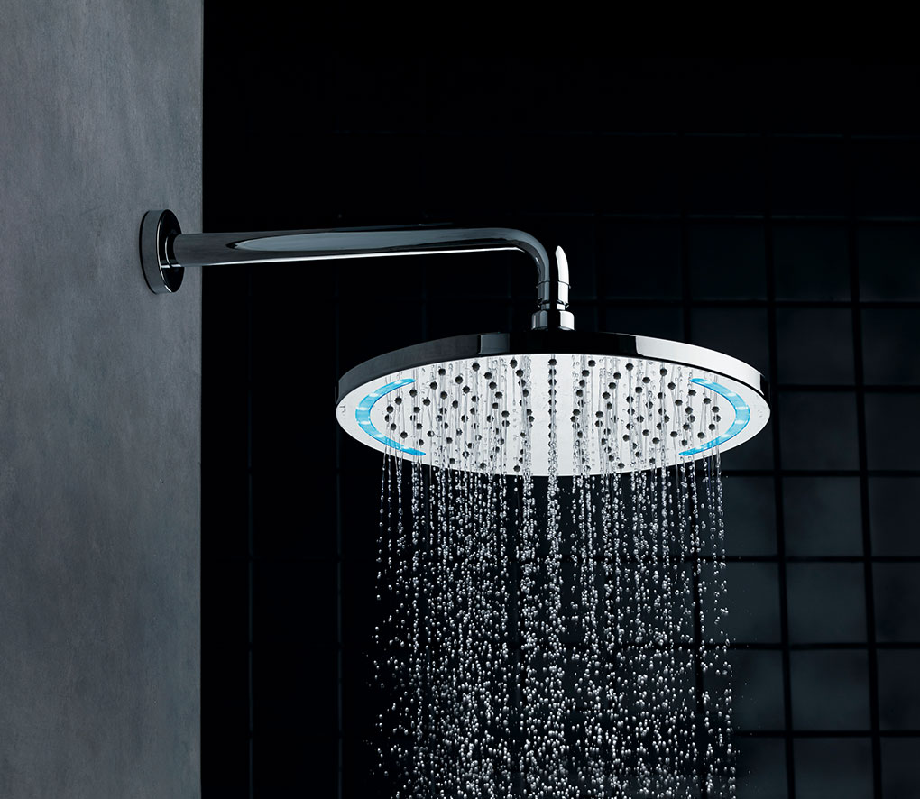 Czy wiesz, że podczas codziennej kąpieli możesz nakarmić niemal wszystkie swoje zmysły? Teraz możesz cieszyć się z niezwykłych wrażeń wzrokowych nie tylko dzięki efektownemu wystrojowi łazienki, ale i technologii LED zastosowanej w głowicy natrysku Technolight. Subtelne światło z łatwością stworzy przyjemną atmosferę i pomoże Ci się zrelaksować. Nowoczesną strefę prysznicową będzie wyróżniać także wyjątkowa oszczędność wody - w głowicy zastosowano inteligentny system dystrybucji, dzięki któremu zużycie wody jest mniejsze, ale nie cierpi na tym siła strumienia - Twoja kąpiel będzie więc zawsze komfortowa. Okrągła deszczownica o średnicy 300 mm cechuje się też eleganckim, minimalistycznym designem, a dzięki barwie chromu, typowej dla większości modeli armatury, głowica łatwo wpasuje się w charakter łazienki.