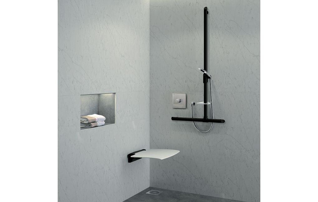 Poręcz Be-Line® w kształcie „T" z przesuwnym drążkiem pionowym Poręcz w kształcie ,,T" posiada przesuwny drążek pionowy, dzięki czemu można ją dostosować do każdego rodzaju istniejącej instalacji. Drążek można przesuwać w lewo lub w prawo, w zależności od umiejscowienia armatury lub głębokości siedziska natryskowego. Dodatkowo, jej zaokrąglony kształt i ergonomiczne spłaszczenie antypoślizgowe ułatwiają optymalny chwyt. Poręcz dostępna jest w trzech wykończeniach: antracytowy metalik, matowa czerń i matowa biel.