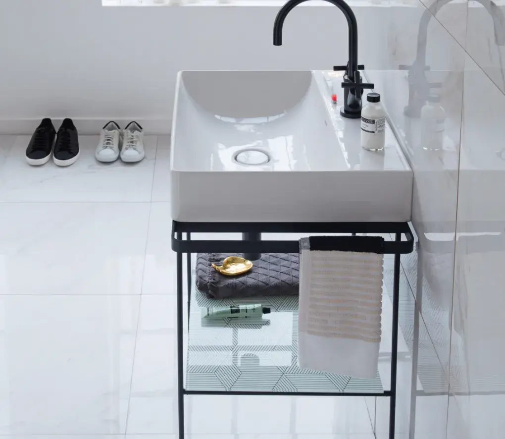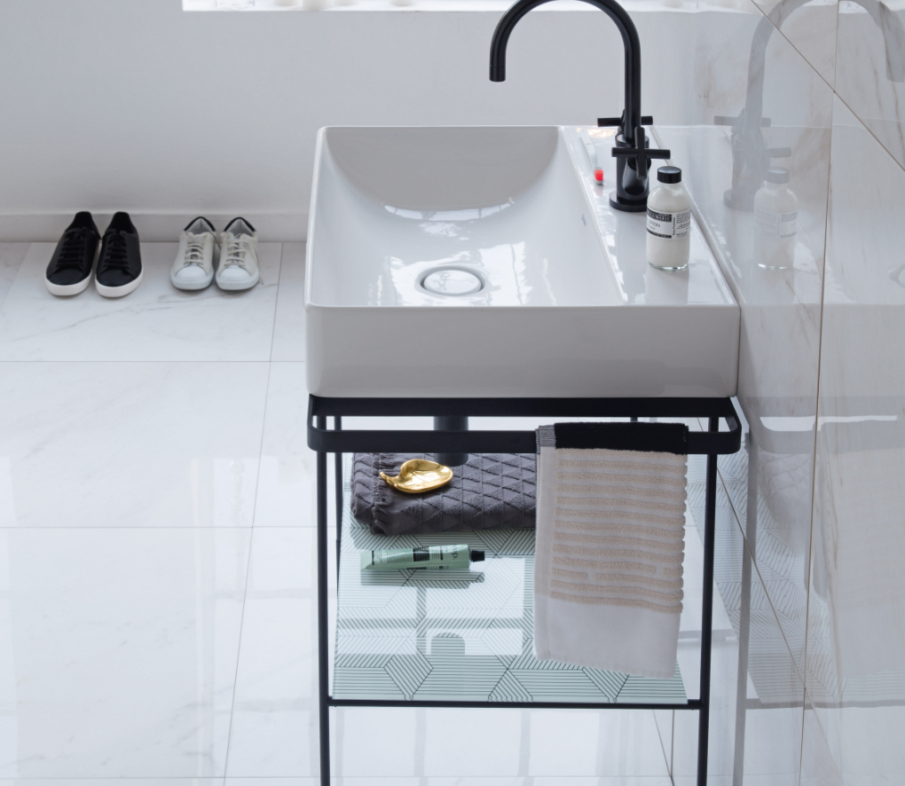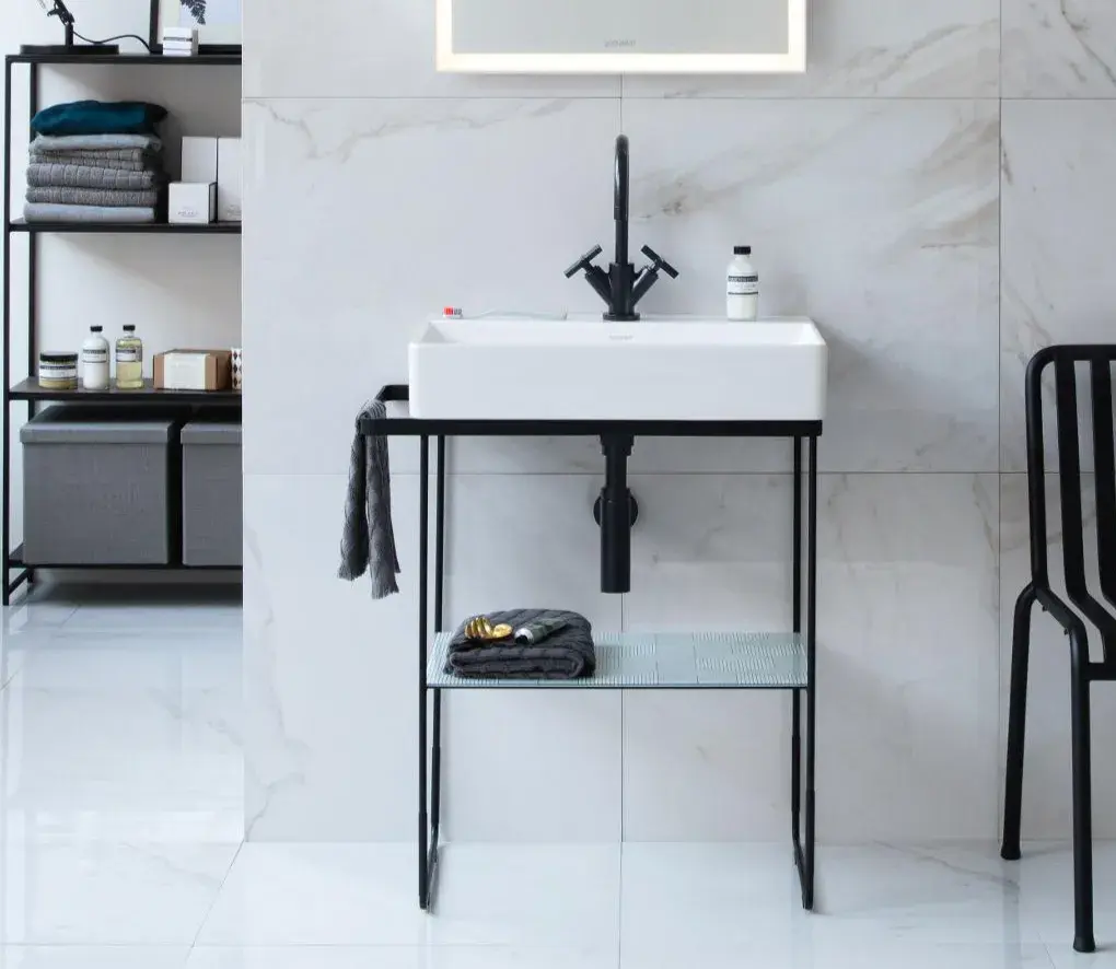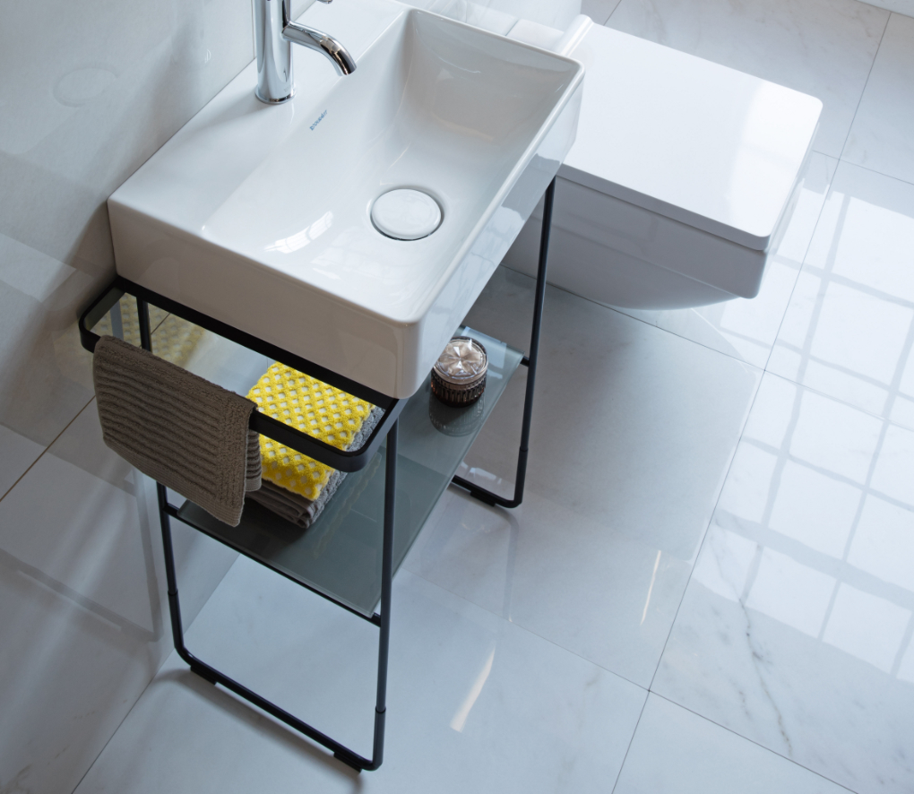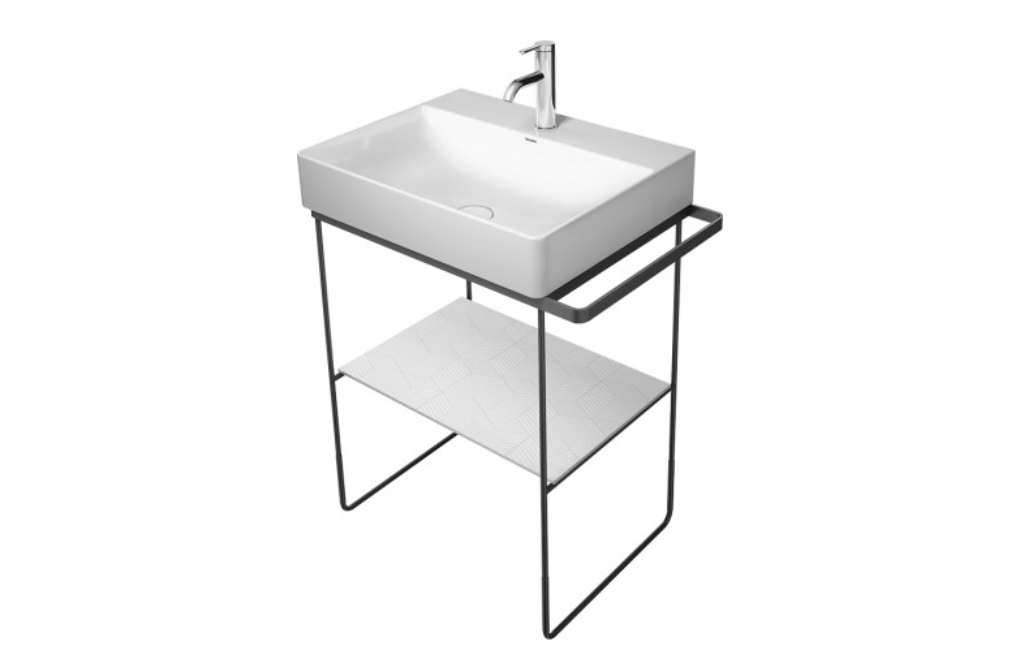 Minimalistyczna łazienka hołdująca nowoczesnym rozwiązaniom stylistycznym, a jednocześnie sprawdzająca się na każdym polu funkcjonalności? Możesz ją mieć w swoim mieszkaniu, jeśli zdecydujesz się na stelaż podumywalkowy Durasquare. Wykonany z cienkich, metalowych elementów, zaskakuje lekkością formy przy jednoczesnym zachowaniu doskonałych parametrów wytrzymałościowych. Czarna barwa podkreśla prosty styl całości i czyni ją na wskroś modernistycznym rozwiązaniem. Na boku stelaża o wymiarach 665x452 mm znajduje się wieszak na ręczniki, zaś w dolnej jego części możesz dodatkowo zainstalować szklaną półkę na akcesoria i kosmetyki. Wysokość produktu jest regulowana, więc miejsce zamontowania umywalki dopasujesz idealnie do potrzeb swoich i pozostałych domowników. Pragniesz urządzić łazienkę pełną gracji i praktycznych rozwiązań? Ze stelażem Durasquare to możliwe!
