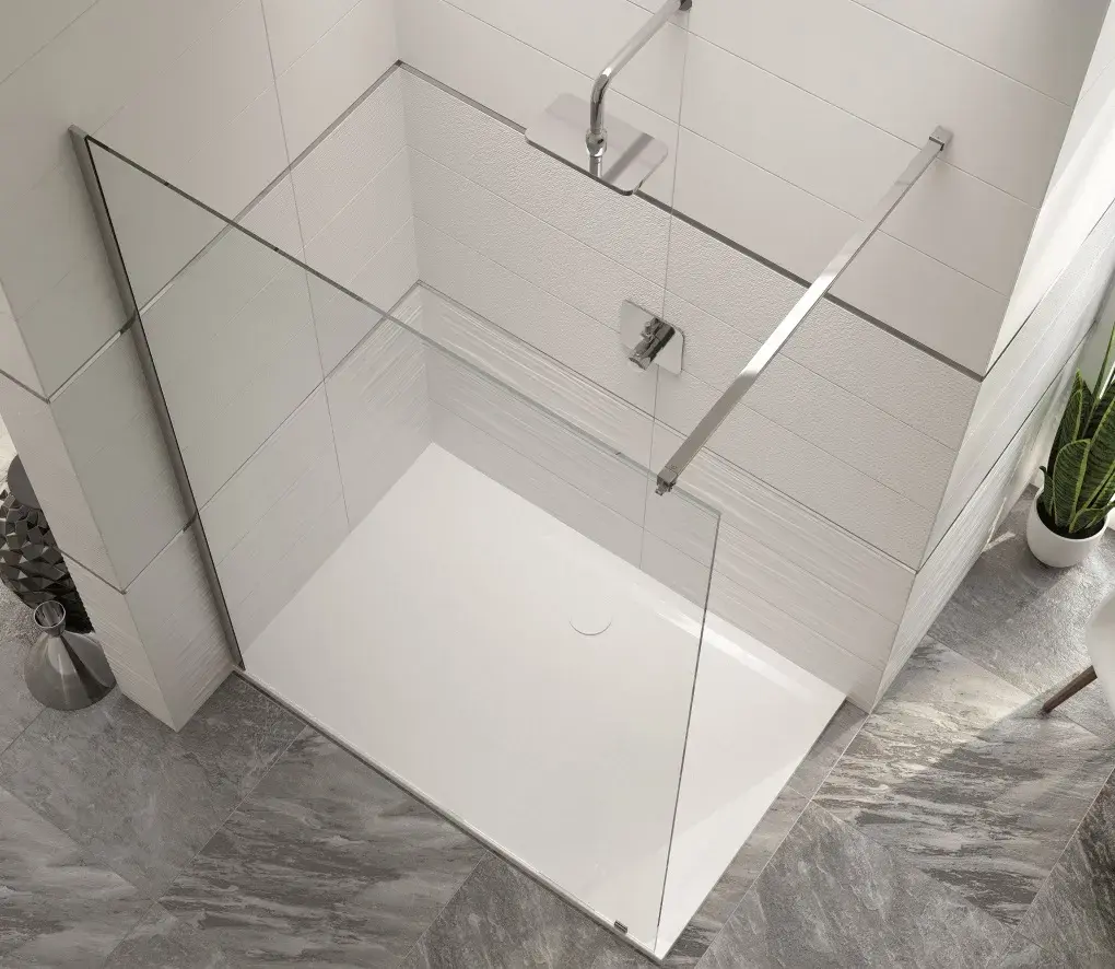 Strefa natryskowa do tej pory kojarzyła się głównie z dość topornymi kabinami prysznicowymi z wysokim brodzikiem. Wszystko zmieniło się, gdy rynek opanowały kabiny Walk-In, w których brodzik jest niemal scalony z posadzką lub też wcale go nie ma. Taki efekt osiągniesz, decydując się na prezentowaną kabinę narożną Walk-In. Model ten łatwo dopasujesz do swoich potrzeb - jest wysoki na 210,3 cm, zaś szerokość ścianki dobiera się indywidualnie z dostępnych rozmiarów. Wykonany został z hartowanego szkła grubości 8 mm i pokrytego powłoką Glass Protect, co świadczy o jego doskonałej trwałości i odporności na uszkodzenia mechaniczne. Kabina wyposażona jest we wspornik zakończony wieszaczkiem, przy pomocy którego zamontujesz całą konstrukcję - używając większej liczby wsporników możesz łączyć kabiny typu Walk-In!