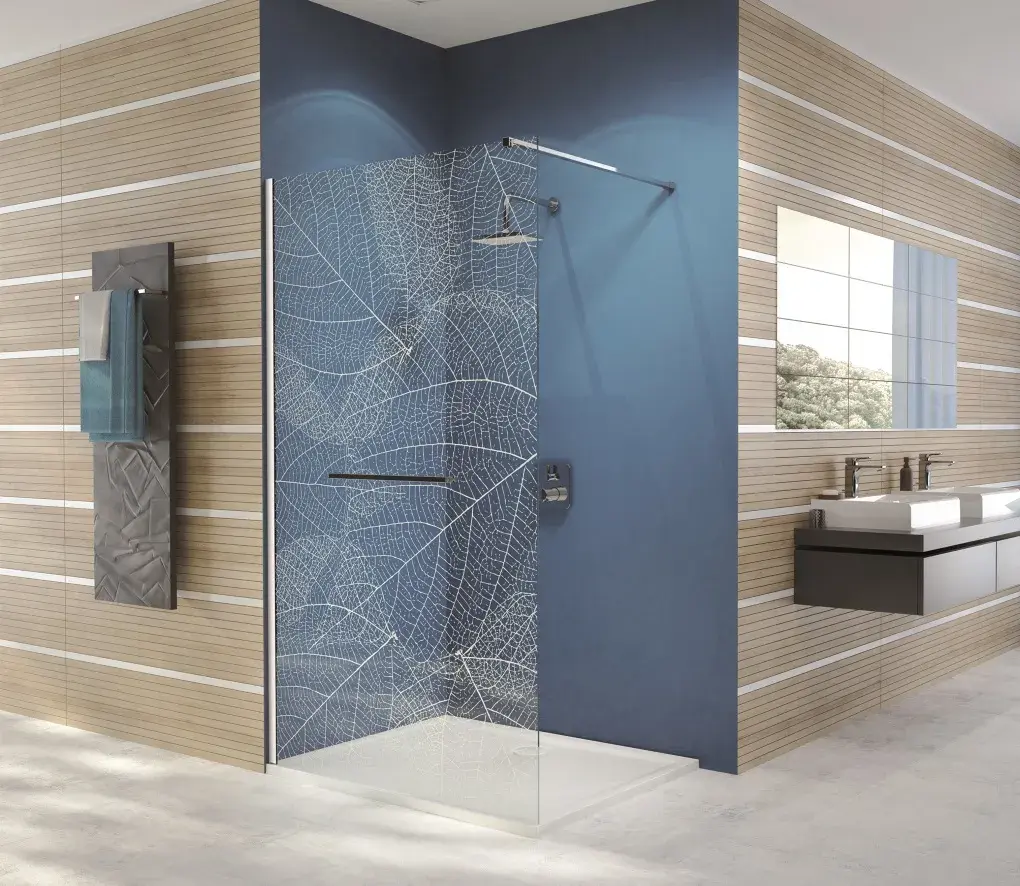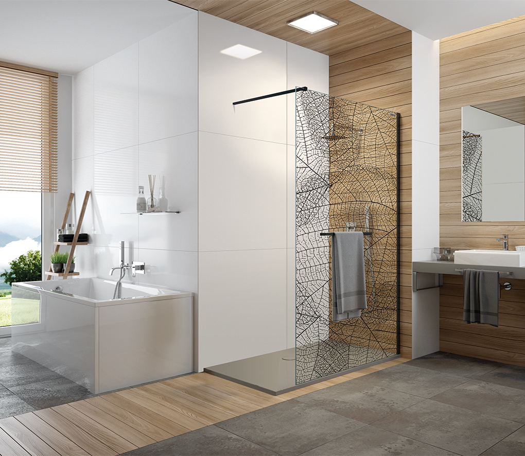 Aranżacje w nowoczesnych łazienkach często nawiązują do natury - dzięki temu wnętrze staje się bardziej przytulne, a komfort codziennych kąpieli wzrasta. Dlatego też na prezentowanej kabinie Walk-In Free Line II zastosowano ozdobę w postaci wzoru wykonanego metodą sitodruku - na szklanej ściance stworzono dekorację przypominającą fakturę liścia. Ścianka z hartowanego szkła o grubości 6 mm pokryta została powłoką Glass Protect - daje to pewność jej trwałości, solidności i odporności na uszkodzenia mechaniczne. Wysokość produktu to 200 cm, zaś szerokość dobierzesz samodzielnie spośród dostępnych rozmiarów. Dołączono do niego także reling na ręcznik, byś mógł go mieć w zasięgu ręki w czasie kąpieli. Efektowne wykończenie kabiny gwarantują także profile - metaliczne połyskujące i czarne matowe.