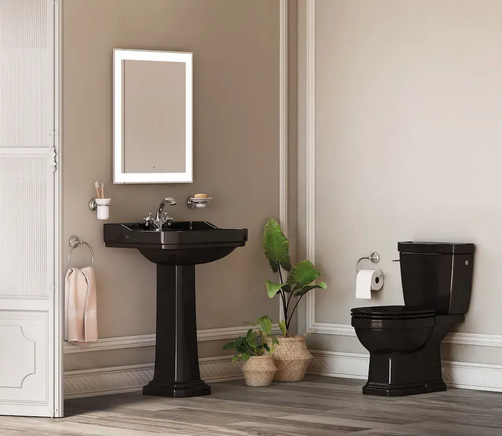 Zapomnij o nudnych aranżacjach łazienkowych - podczas urządzania strefy toaletowej wykorzystaj miskę kompaktową WC z kolekcji Carmen, aby osiągnąć niezwykły efekt dekoracyjny i zadbać o pełną funkcjonalność całego pomieszczenia. Tym, co jako pierwsze zwraca uwagę, jest czarne, połyskujące wykończenie ceramiki, kojarzące się przede wszystkim z nowoczesnymi aranżacjami wnętrz. Jednak nie wszystko jest tutaj jednoznaczne. Ciemna kolorystyka zestawiona została bowiem z klasyczną formą kompaktu oraz zdobieniami, nadającymi całości nieco wiktoriańskiego sznytu - taka fuzja z pewnością zachwyci osoby lubujące się w oryginalnych dekoracjach. Warto jednak wspomnieć o praktycznej stronie miski WC - w jej wnętrzu nie znajdziesz kołnierza spłukującego. Bezrantowa konstrukcja ułatwia zachowanie toalety w perfekcyjnej czystości i higienie.