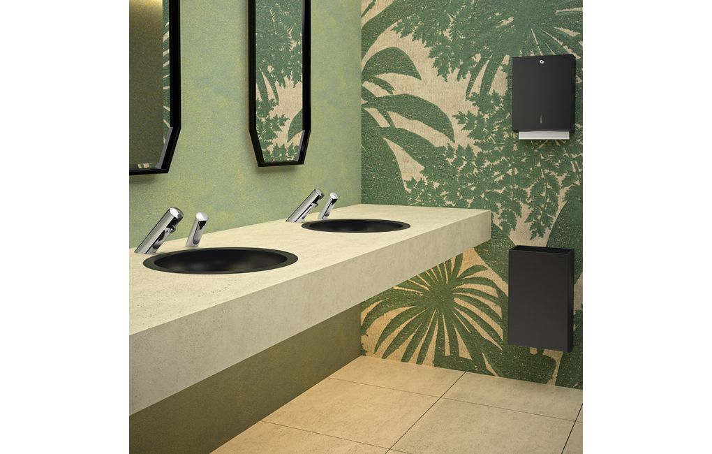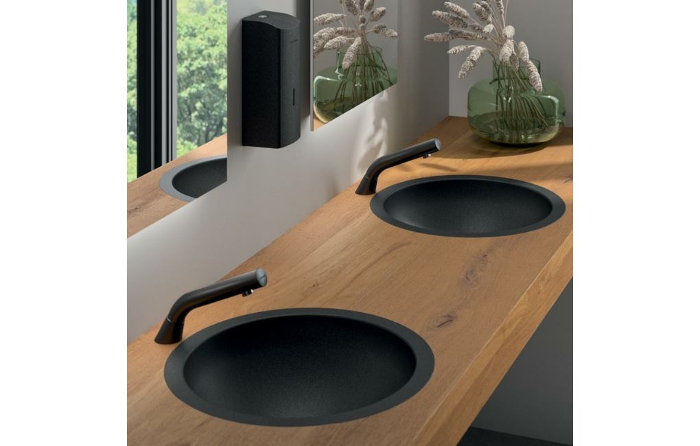 Umywalka do zabudowy HEMI Elegancka okrągła umywalka, dostępna w wersji wpuszczanej w blat oraz podblatowej, łączy nowoczesny design z funkcjonalnością. Jej wewnętrzna średnica wynosi 385 mm, a otwory do instalacji mają średnicę 400 mm dla wersji wpuszczanej oraz 380 mm dla podblatowej. Wykonana z bakteriostatycznego Inoxu 304 o grubości 0,8 mm, umywalka wyróżnia się matowym czarnym wykończeniem z Teflonu®, które zapewnia trwałość i łatwość w utrzymaniu czystości.